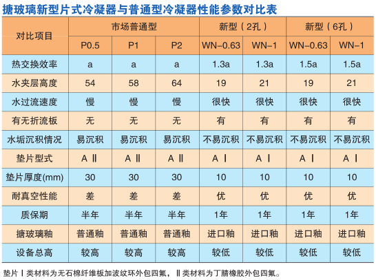 1、搪玻璃冷凝器可處理除氫氟酸、光氣、濃硫酸(濃度>30‰,溫度>180℃)、強堿(溫度>100℃)及一切含氟離子外的化工介質(zhì)。 2、體積小、重量輕、結(jié)構(gòu)緊湊,通過熱氣流和冷卻水的逆向流動進行熱交換。 3、經(jīng)過一定的使用期限后,如發(fā)生部件損壞,可進行局部替換或減少單片,不會造成整臺設(shè)備報廢或停產(chǎn),延長了整臺設(shè)備的使用壽命。 4、本產(chǎn)品可耐完全限真空(真空度須緩慢增加),且不易結(jié)污垢,與同類搪玻璃片式冷凝器相比,熱交換效率可提高30%—50%。 5、本產(chǎn)品分NW-0.63型和NW-1型兩種。另外每種型號分為2孔和6孔兩種規(guī)格。NW-2型待開發(fā)。 |